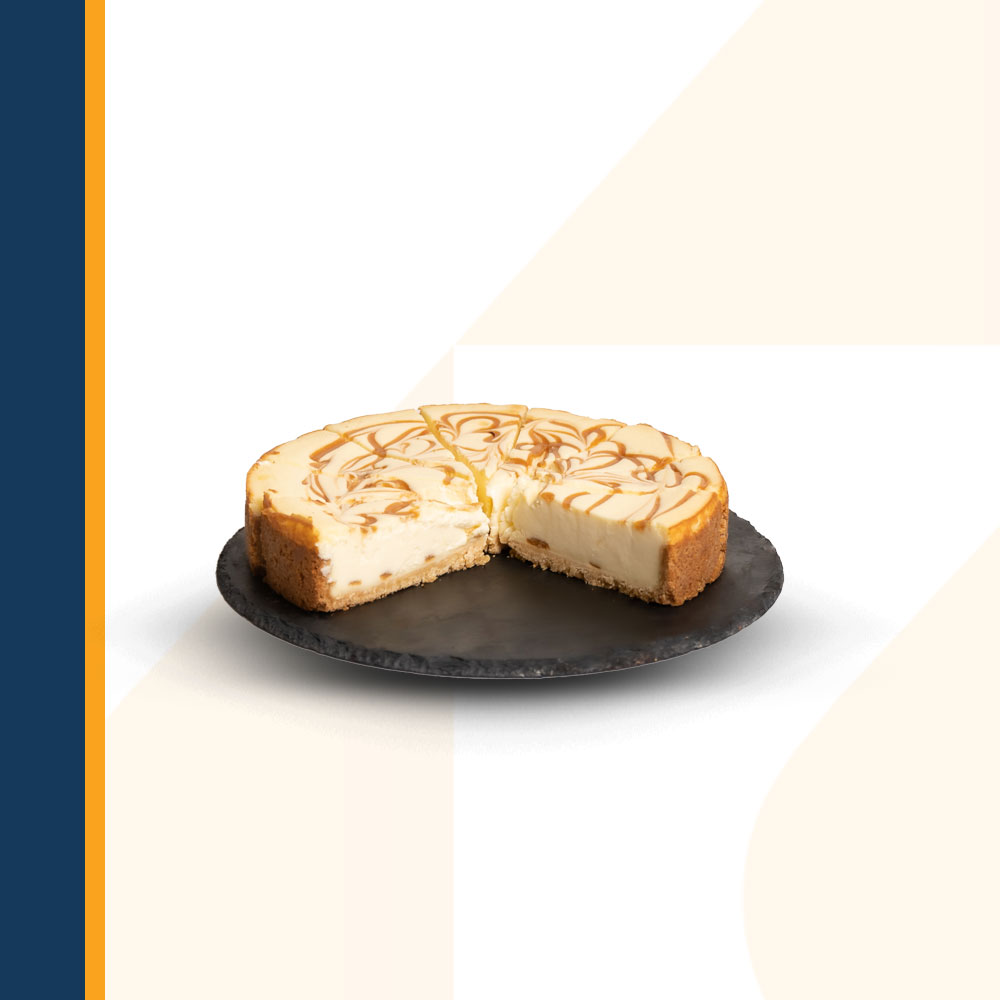 Cheesecake and Dulce de leche, with pure cream and cream cheese on the top layer and cream cheese and dulce de leche on the bottom, with a digestive biscuit and butter base. Decorated with marbling with dulce de leche. This cake is 100% palm fat free