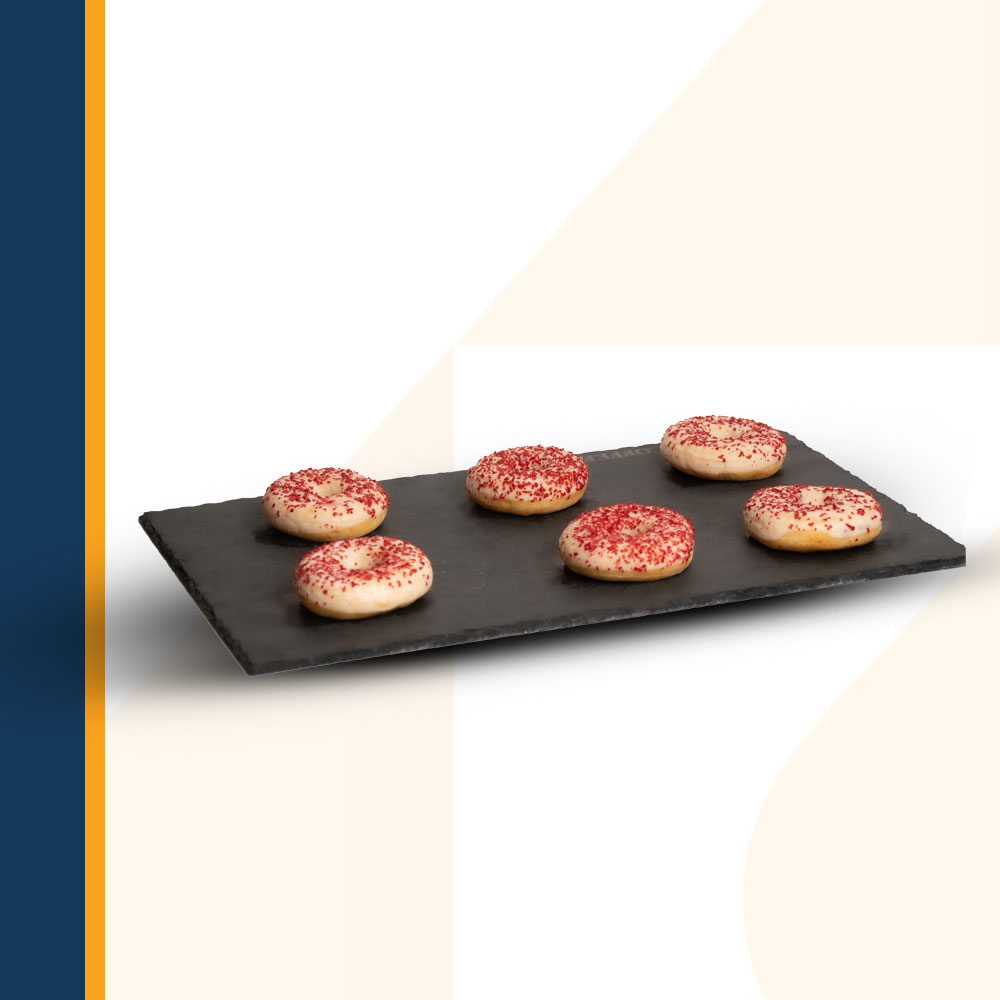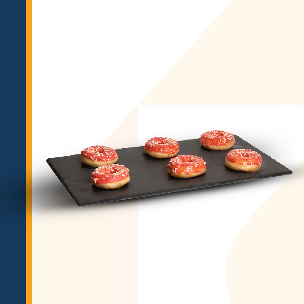 Fried and deep‐frozen yeast raised dough, donut filled with strawberry filling (22%) coated with a white compound coating (11,5%) and decorated with freeze dried raspberry crunch (1%), ready‐to‐serve